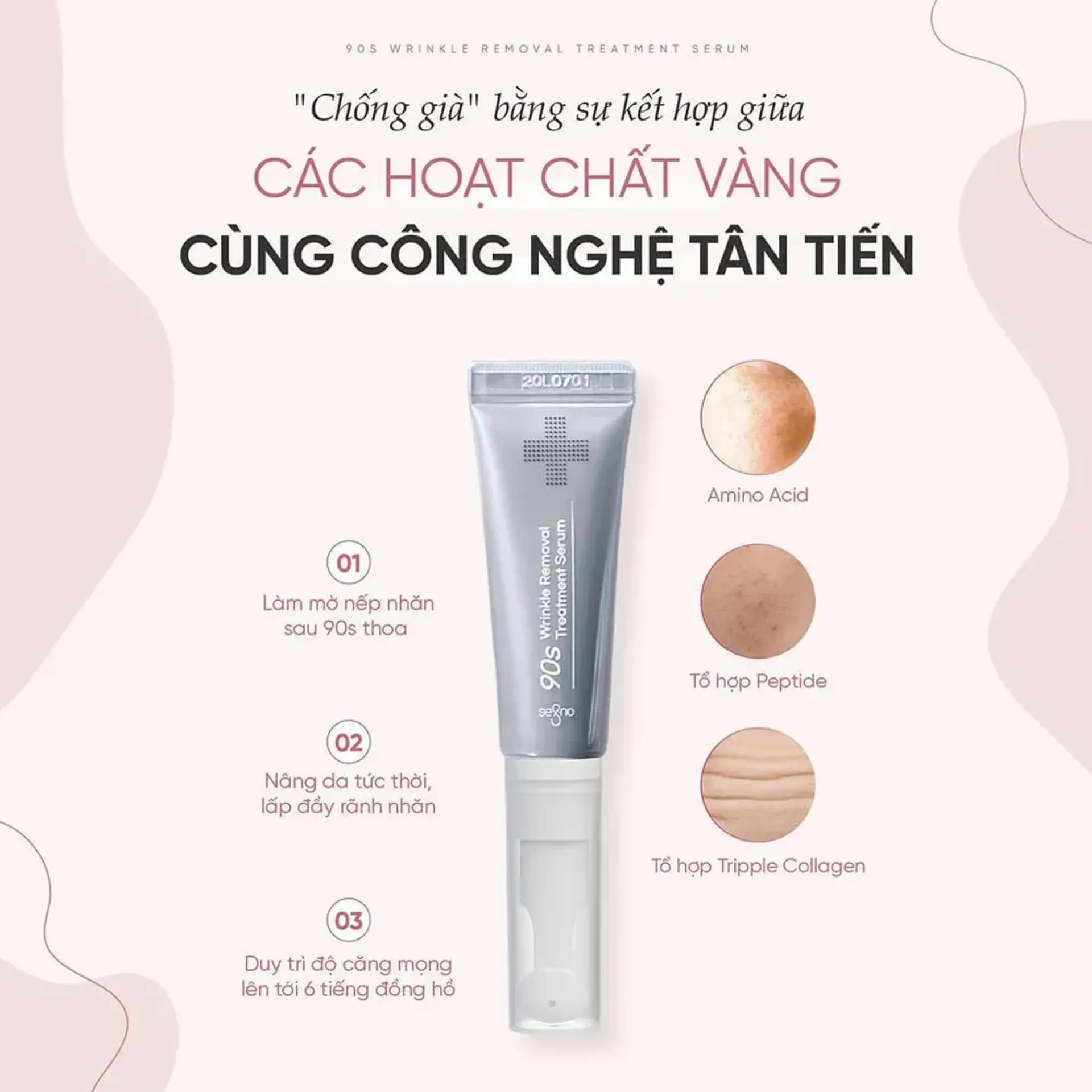 Công dụng: Tinh chất làm đầy nếp nhăn 90s giúp lấp đầy nếp nhăn, kích thích sản sinh Collagen, giúp phục hồi làn da, duy trì cho phái đẹp một làn da khoẻ, căng mịn và tràn đầy sức sống.